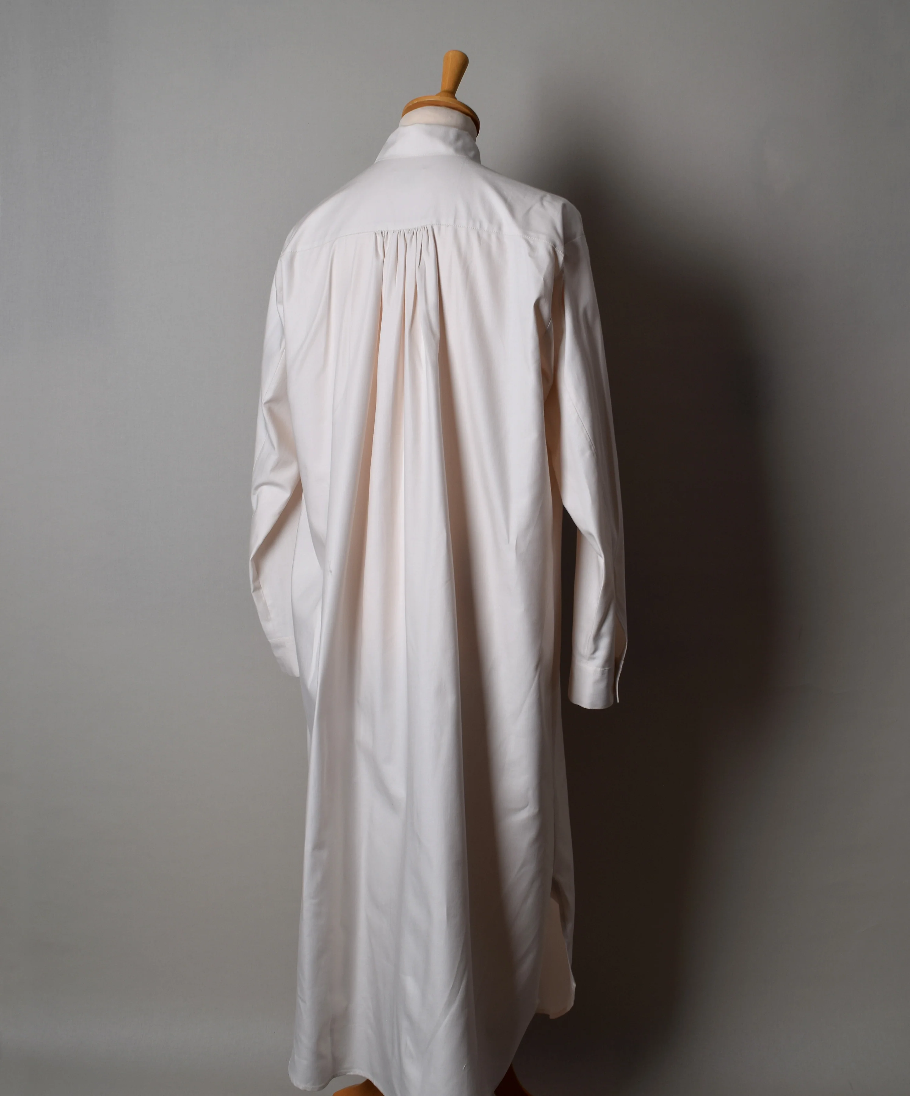 Like the day shirts of the time this nightshirt has been refined by use of a yoke and the tails are now curved rather than straight across.