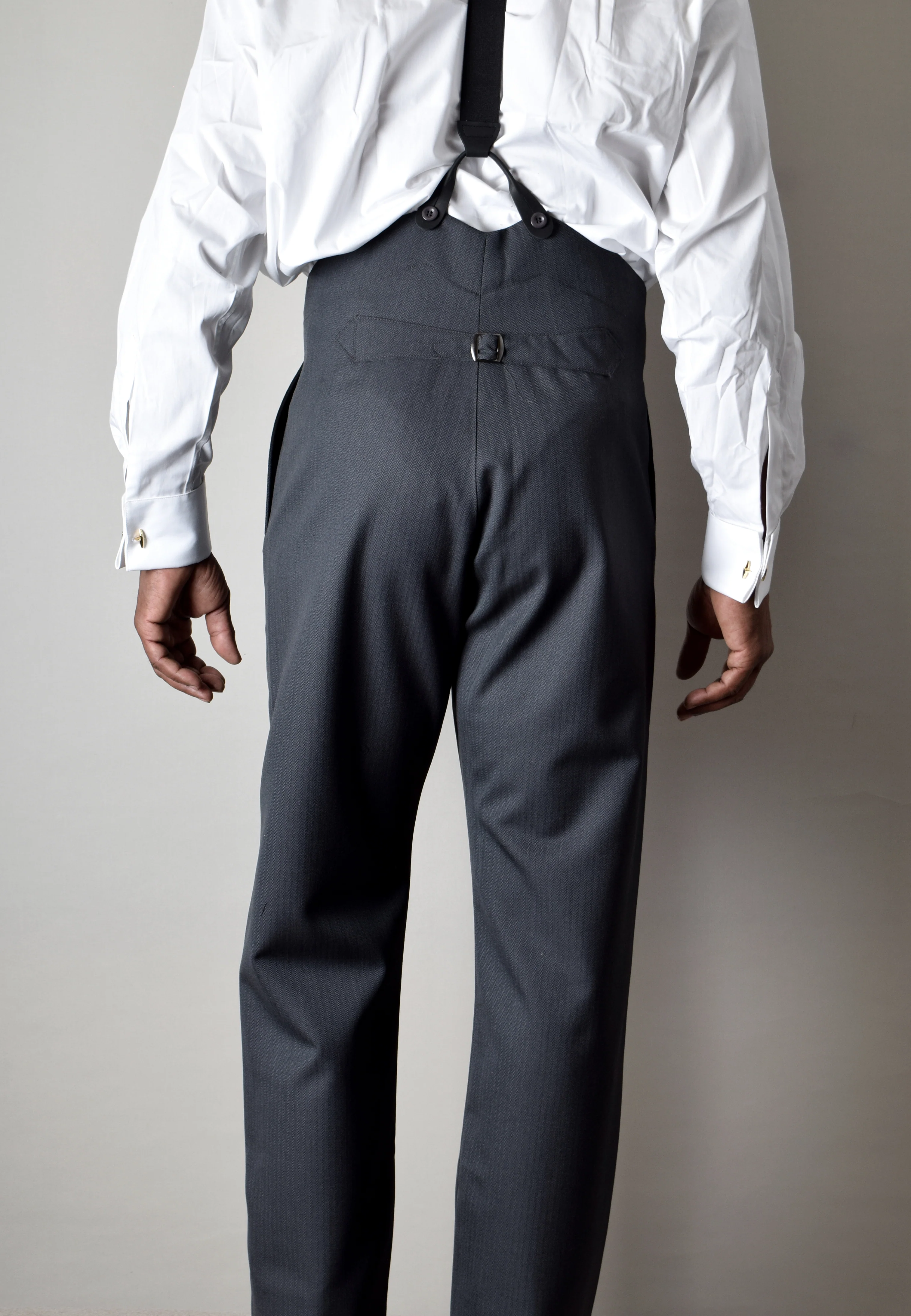 They are best worn with our button braces as they should sit higher on the body than the modern position which is lower towards the hips.