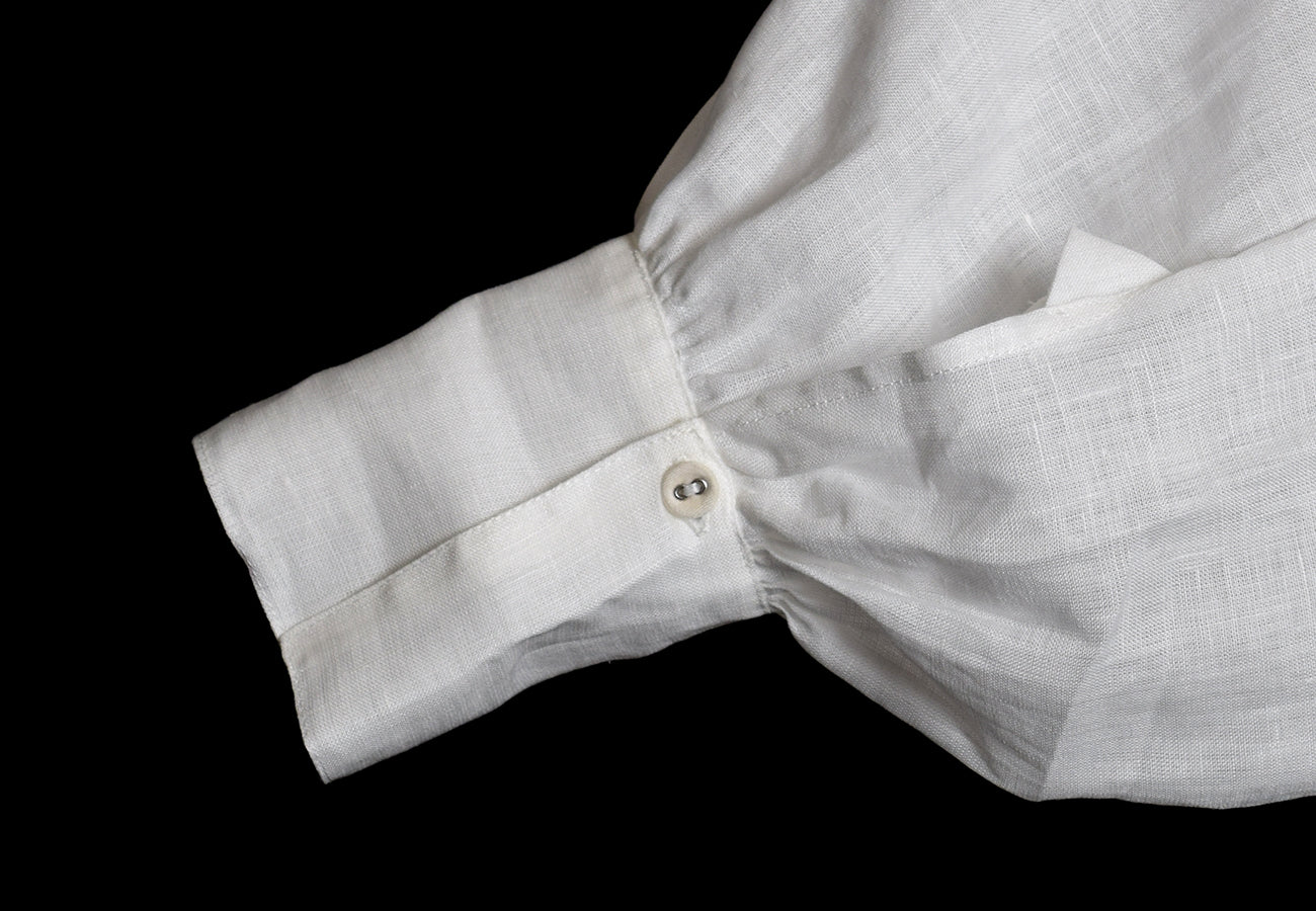 This shirt was taken directly from an original garment. It shows the transition around 1820 of the basic square cut of previous centuries towards a more tailored front using pleats to control the fullness on the bib.