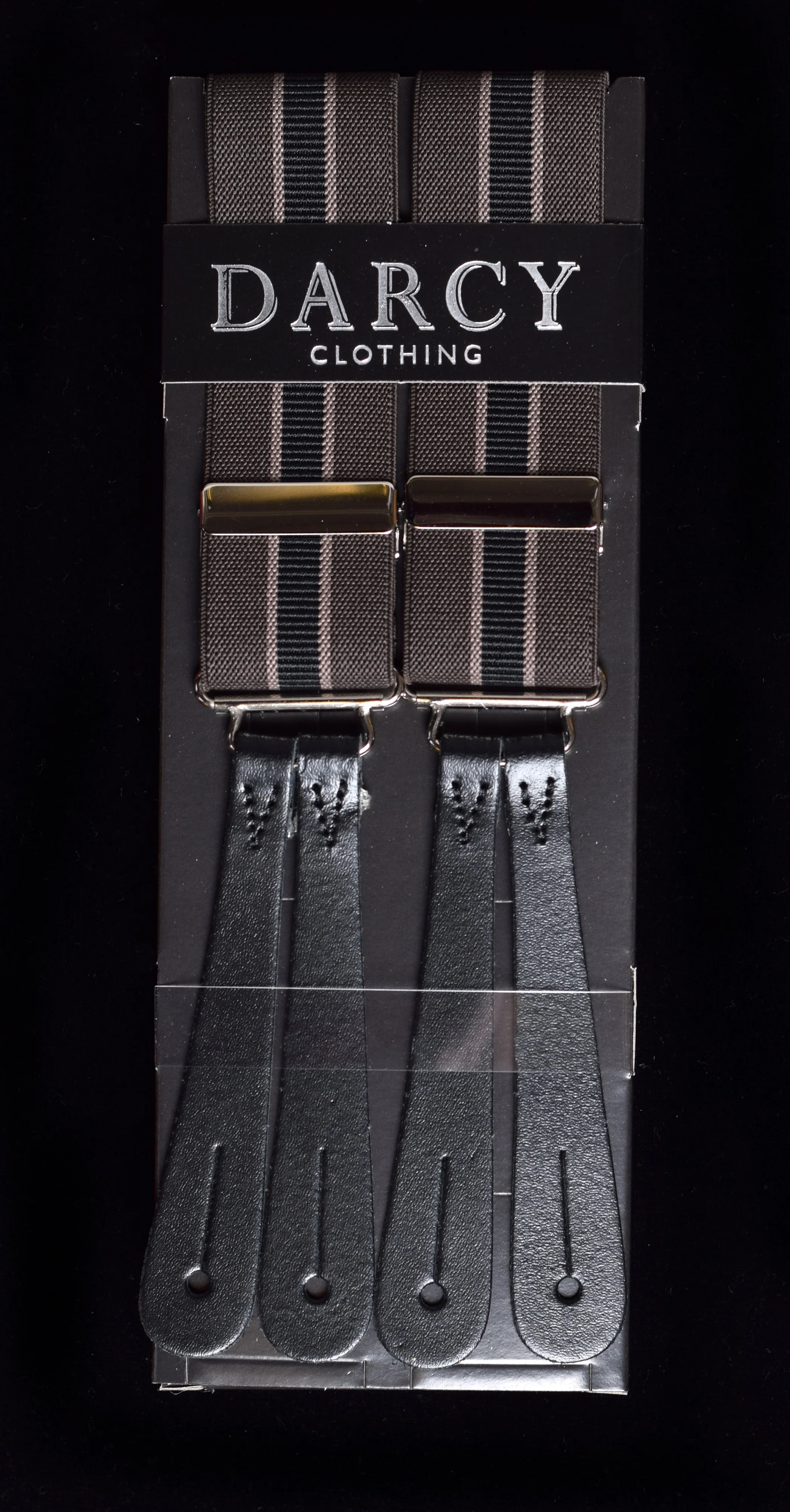 Robust button-on braces in muted stripes with traditional fixed leather ends. The Y back prevents these braces from slipping off shoulders. The straps are elasticated throughout.